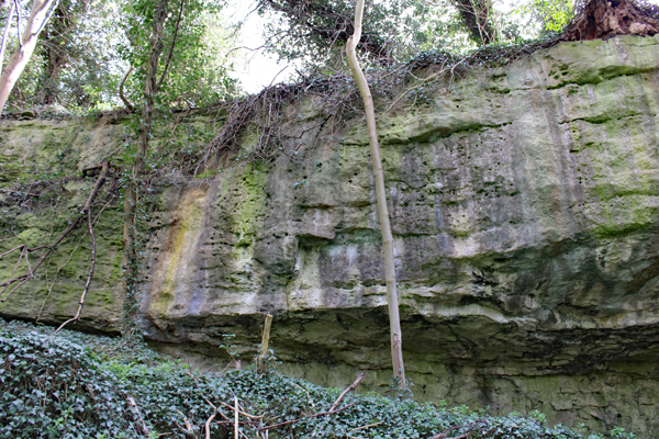 Before long, I came across a line of crags formed by dolomitic limestone of the Sprotbrough Member of the Cadeby Formation, whose upper section is composed of very massive beds, with solution hollows being common in places.