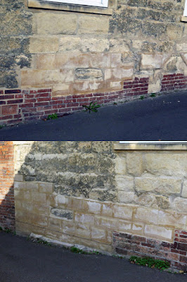 I didn’t stop to look at this and proceeded through the gateway down towards the Bishop's Palace, where the lower part of the south wall of the Cantilupe Chantry South had been recently repaired, and I was interested to see that the new stone was damp and covered in efflorescent salts.
