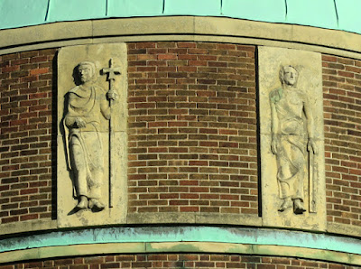 Moving closer, I was particularly interested in the low-relief figurative sculptures beneath the dome, which depict the twelve Apostles. According to Taking Stock, they were carved by Alan Rochford, the brother of the architect, and his wife Sylvia - both lecturers at Nuneaton College of Art.